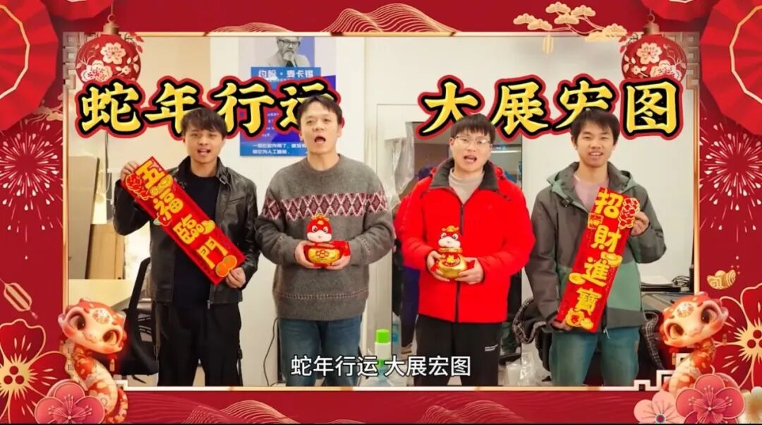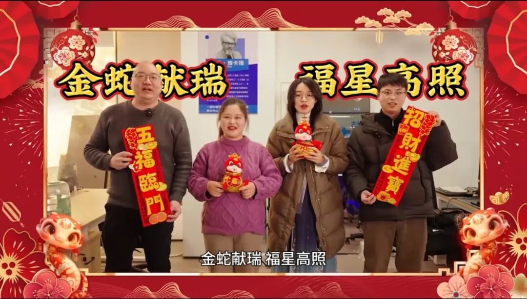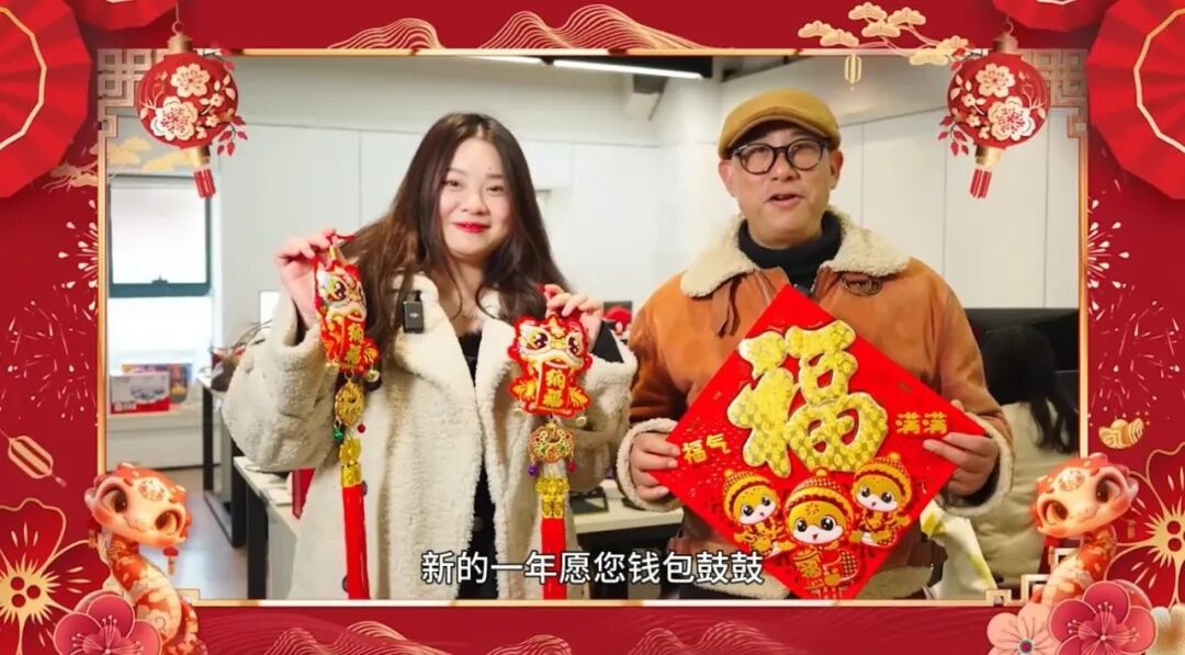 带着可爱的吉祥物小福蛇,老板亲自出马,威风凛凛地站在台前,祝愿大家:“新的一年,祥光护体,好运盈门!”